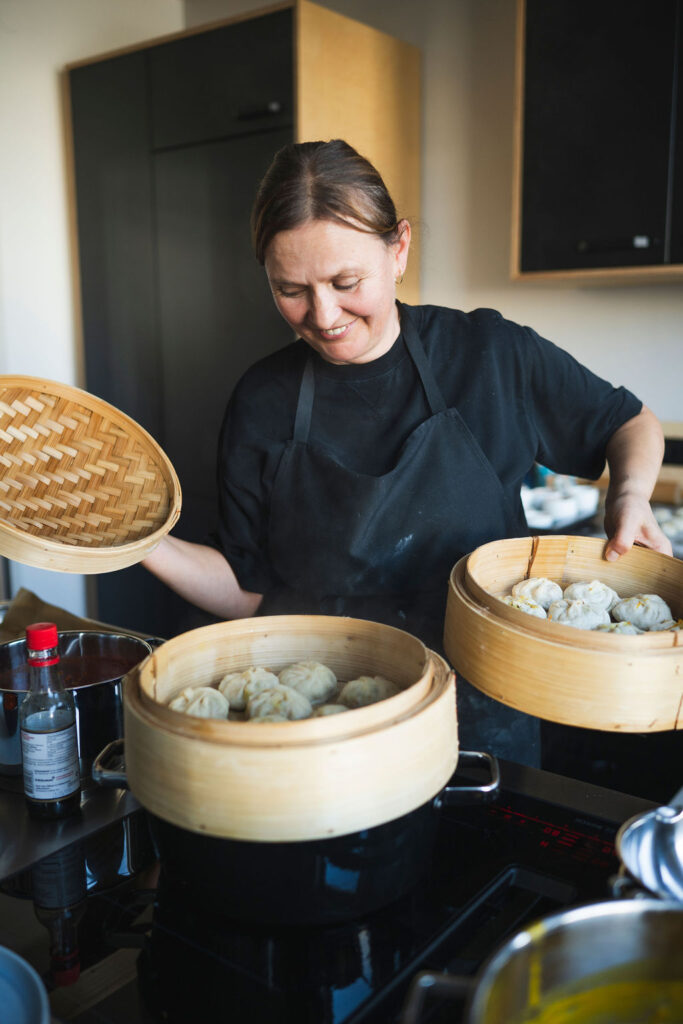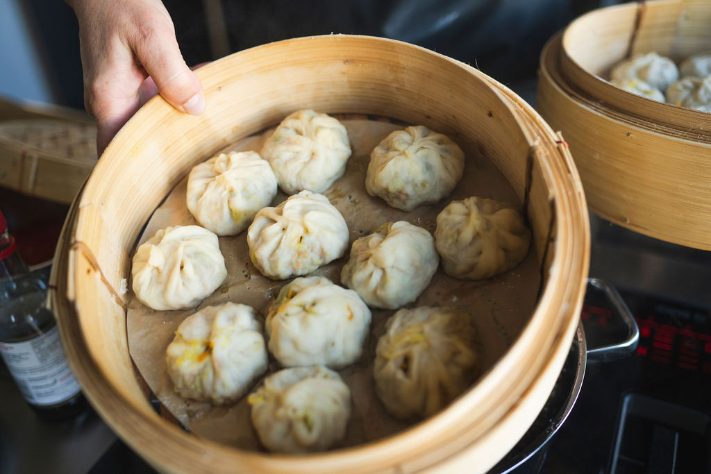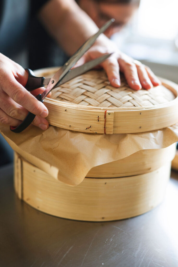 5. Backpapier zuschneiden und in einen Dämpfkorb legen, damit die Momos beim Garen nicht ankleben. Die Momos für 15 Minuten über kochendem Wasser dämpfen.